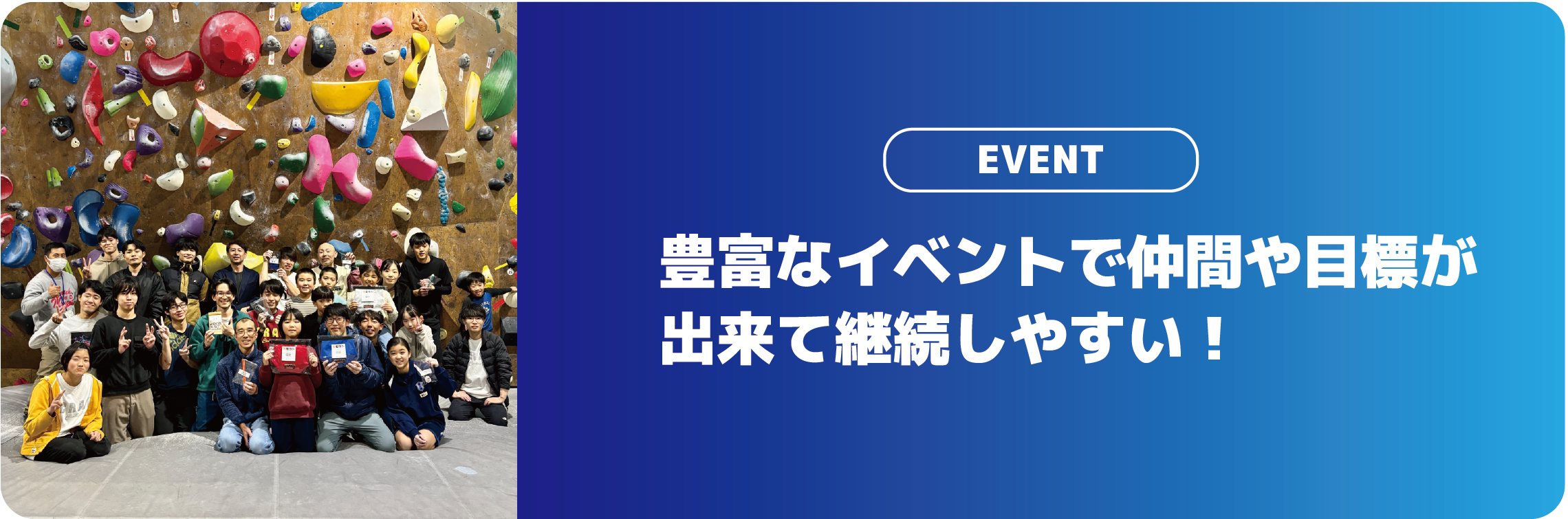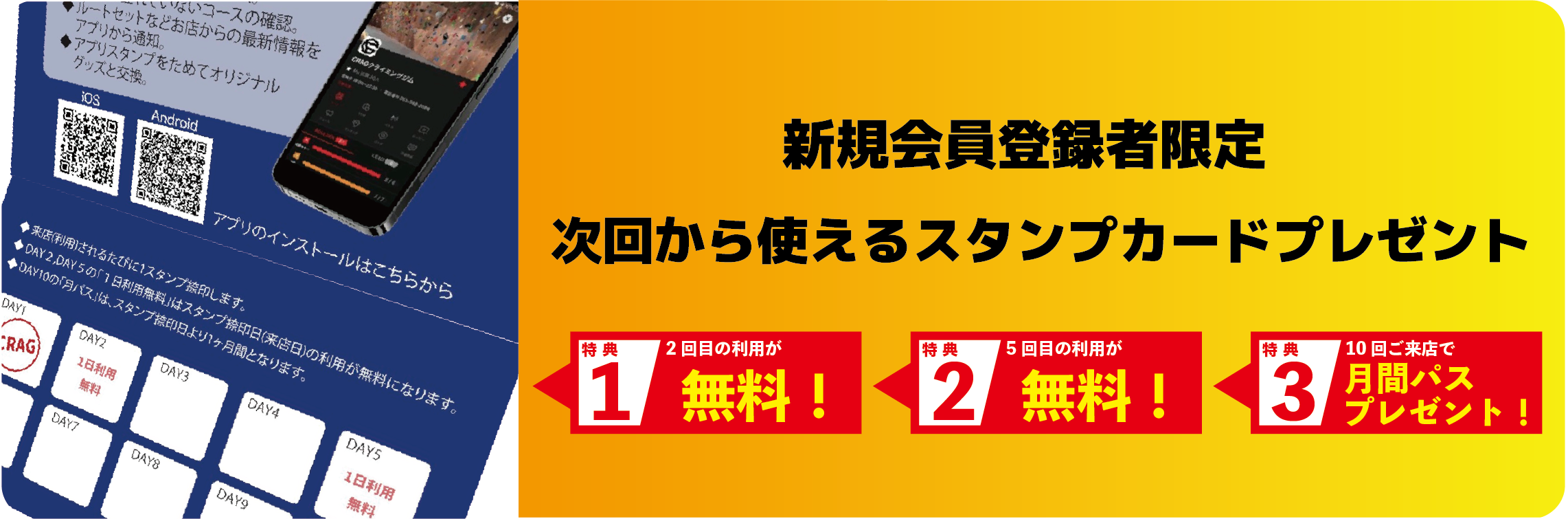 クライミングが初めての方へ クライミングが初めてですか?CRAGクライミングジムのスタッフがあなたのクライミングデビューをサポートします!クライミング経験豊富なインストラクターが、丁寧に登り方やクライミングに関するご質問にお応えします。CRAGクライミングジムはロープを使わないボルダリングをお楽しみいただける施設です。初めての方でも楽しめるコースがたくさんあります。安心してご来店ください。子供からご年配の方まで、どなたでもクライミングを楽しみいただけます。 ボルダリングを楽しもう!! 講習は以上となります。体験プランでのご利用は講習後1時間自由に当施設をご利用いただけます。ご不明な点や登り方がわからない際はお気軽にスタッフにお声がけください。
